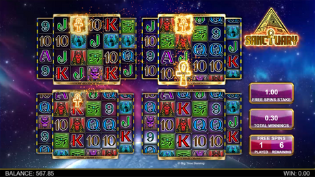 Get comfy and allow Sanctuary to take you on an immersive journey into ancient Egypt. The game board looks like an old stone tablet, covered in drawings and mysterious symbols. Golden Ankh symbols sparkle like they have special powers, potentially bringing you a bonus round and big wins.